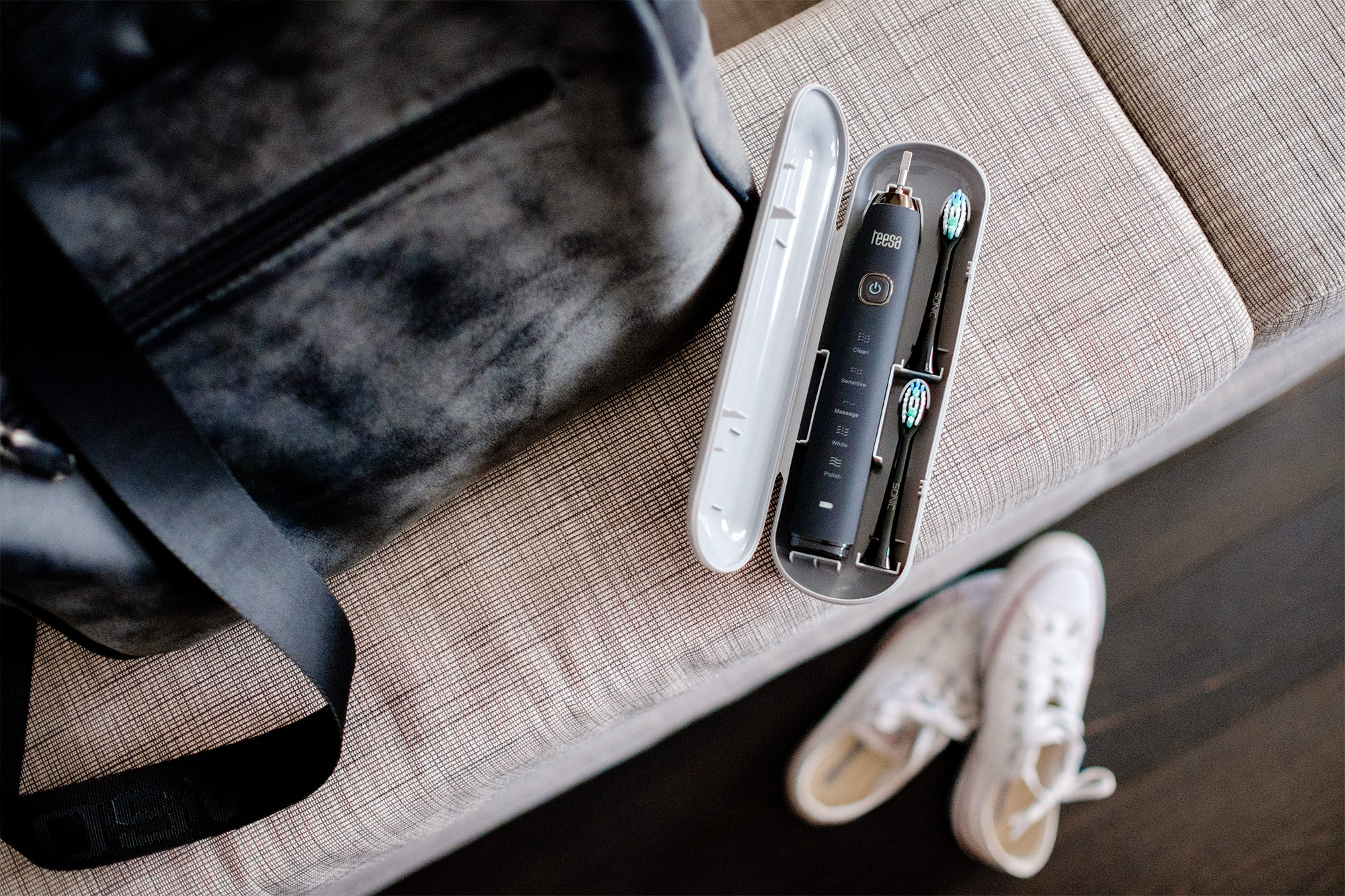Nie zabierasz w podróż szczoteczki sonicznej, bo boisz się, że urządzenie uszkodzi się w walizce? Teraz to nie jest problem! Wraz ze szczoteczką SONIC Black otrzymujesz podróżne etui, dzięki któremu będziesz mógł zabierać szczoteczkę zawsze ze sobą i dbać o swój uśmiech tam, gdzie chcesz.
