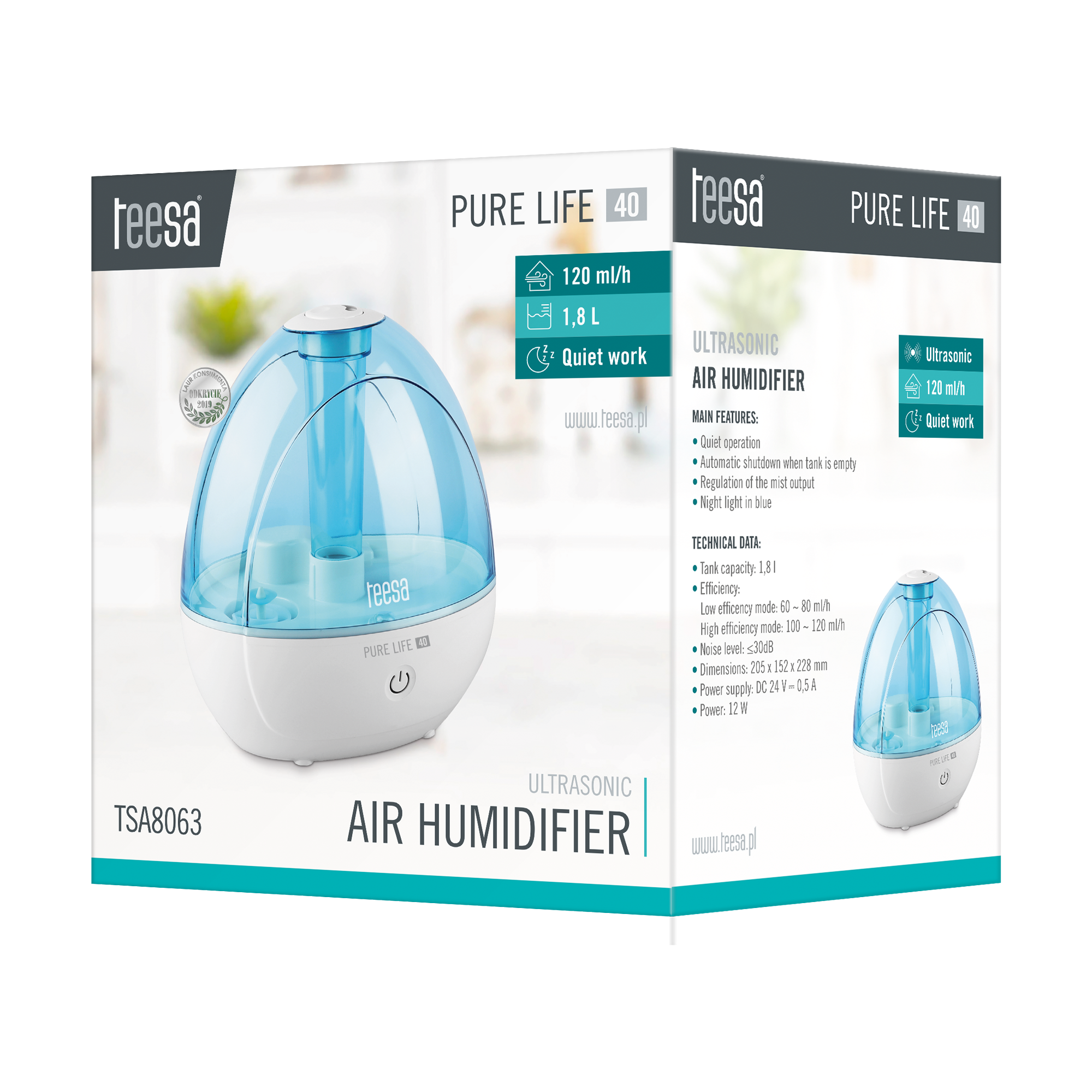 Ultradźwiękowy nawilżacz powietrza TEESA PURE LIFE 40