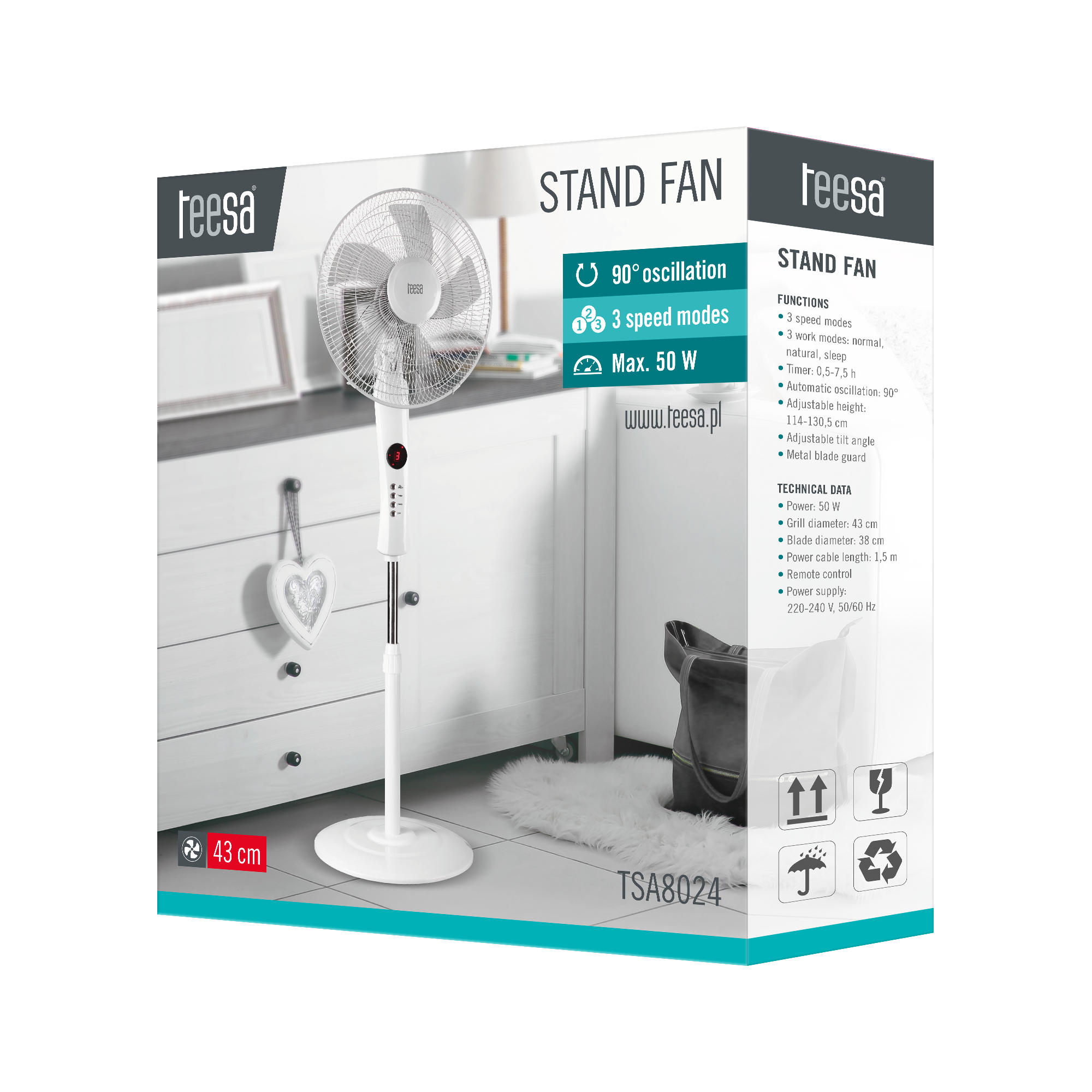Duża średnica śmigieł, napędzanych silnikiem o mocy 50 W, w połączeniu z funkcją automatycznej oscylacji, umożliwiającej obrót wentylatora w kierunku bocznym – o 90° – w jedną, jak i w drugą stronę sprawiają, że rześkie, chłodne powietrze dotrze do każdego kąta pomieszczenia.