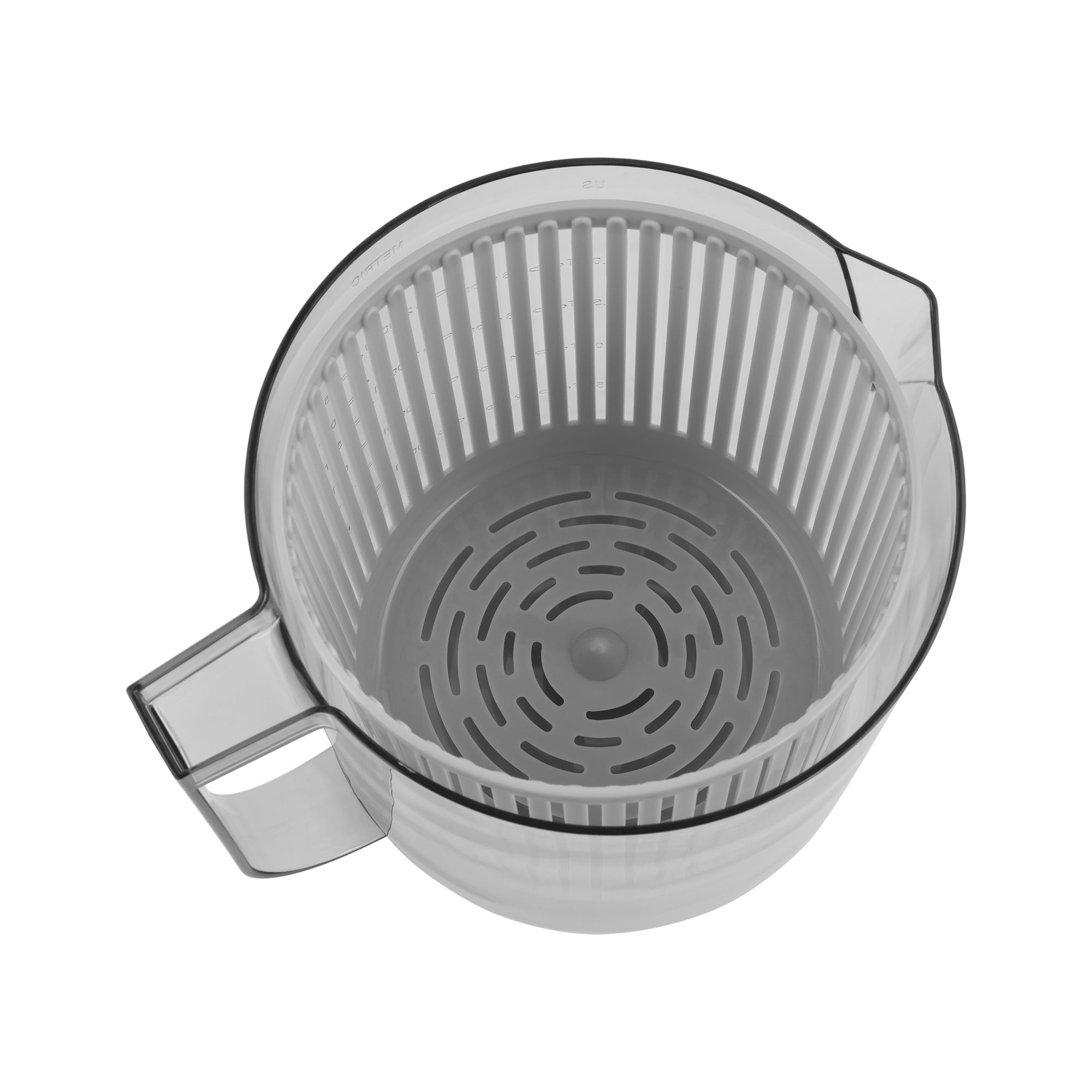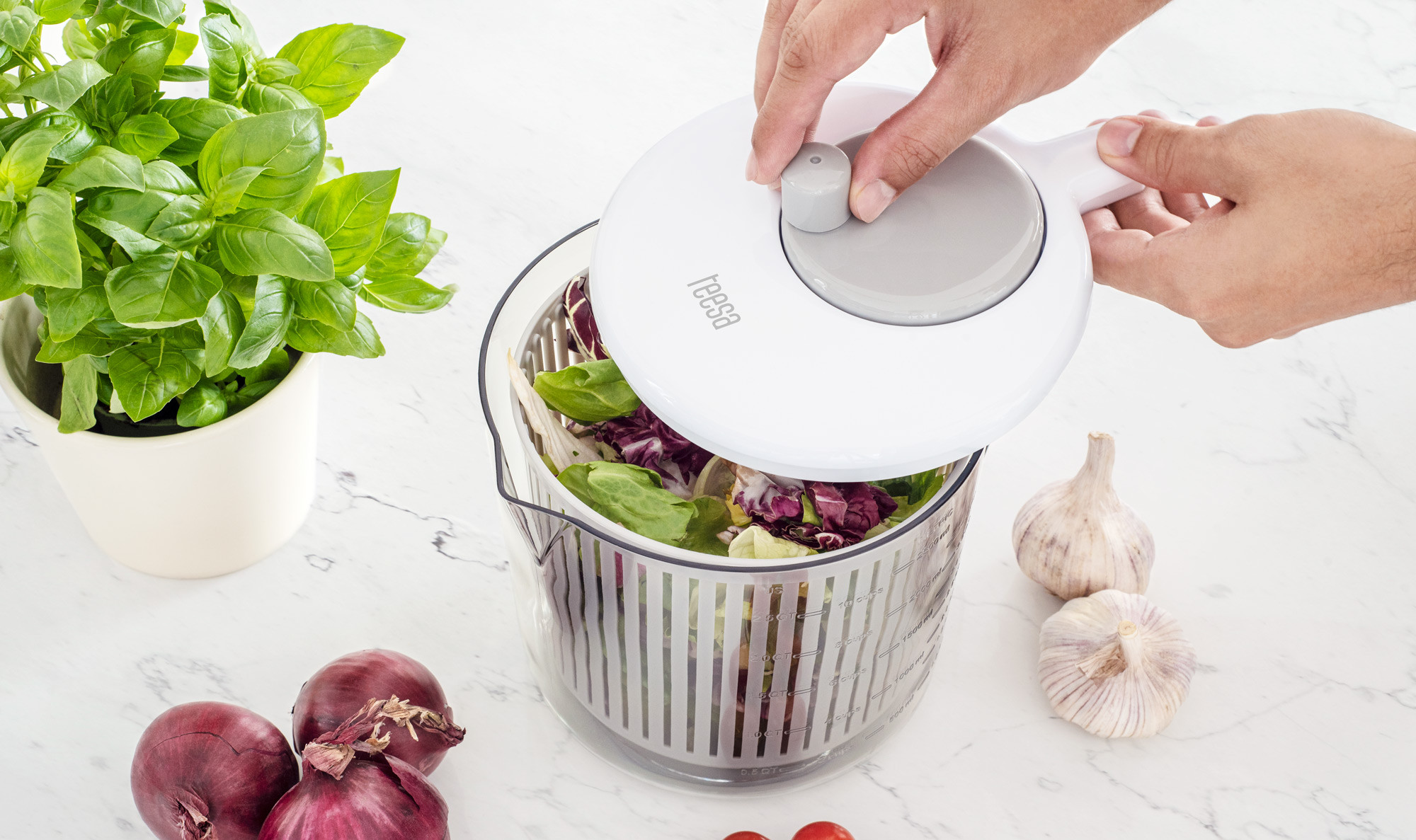 Po wyjęciu części do suszenia sałaty, pojemnik możesz także użyć do przygotowywania innych potraw. Tym bardziej, że na jego ściankach umieszczona została podziałka litrażowa, dzięki czemu nie potrzebujesz dodatkowego naczynia do odmierzania składników. Z kolei wewnętrzną część suszarki możesz wykorzystać również jako cedzak.
