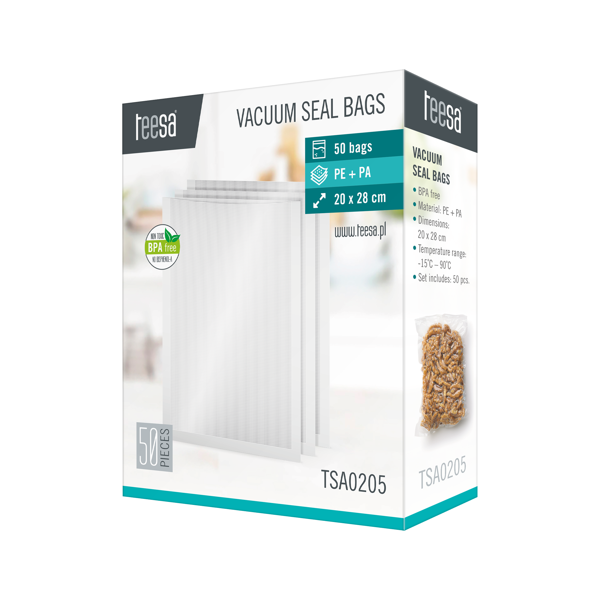 Worki do zgrzewarki próżniowej Teesa, to specjalne opakowania wykonane z solidnego i przeznaczonego do kontaktu z żywnością tworzywa, których możesz użyć do przechowywania produktów spożywczych w sposób, który minimalizuje kontakt z powietrzem.Zestaw TSA0205 zawiera 50 szt. worków do zgrzewania próżniowego o wymiarach 20x28 cm. Wysoki poziom przejrzystości worków, pozwala na szybki wgląd w przechowywaną żywność.
