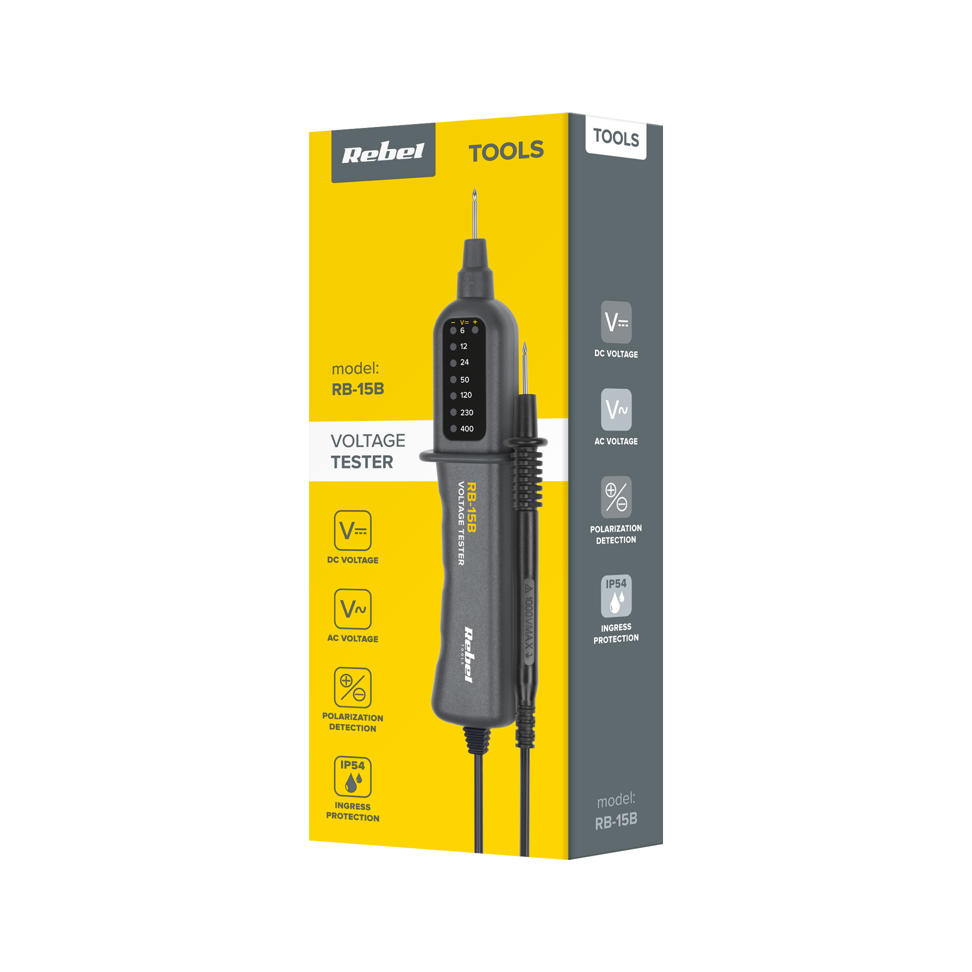 Wskaźnik REBEL RB-15B umożliwia pomiar napięcia zarówno prądu zmiennego (AC), jak i stałego (DC) w zakresie od 6 V do 400 V. Urządzenie automatycznie dostosowuje zakres pomiarowy, co ułatwia pracę i eliminuje potrzebę ręcznego ustawiania zakresu. Funkcja detekcji polaryzacji napięcia DC dodatkowo zwiększa dokładność pomiarów, pozwalając na szybkie i precyzyjne rozpoznanie biegunowości w badanych obwodach.