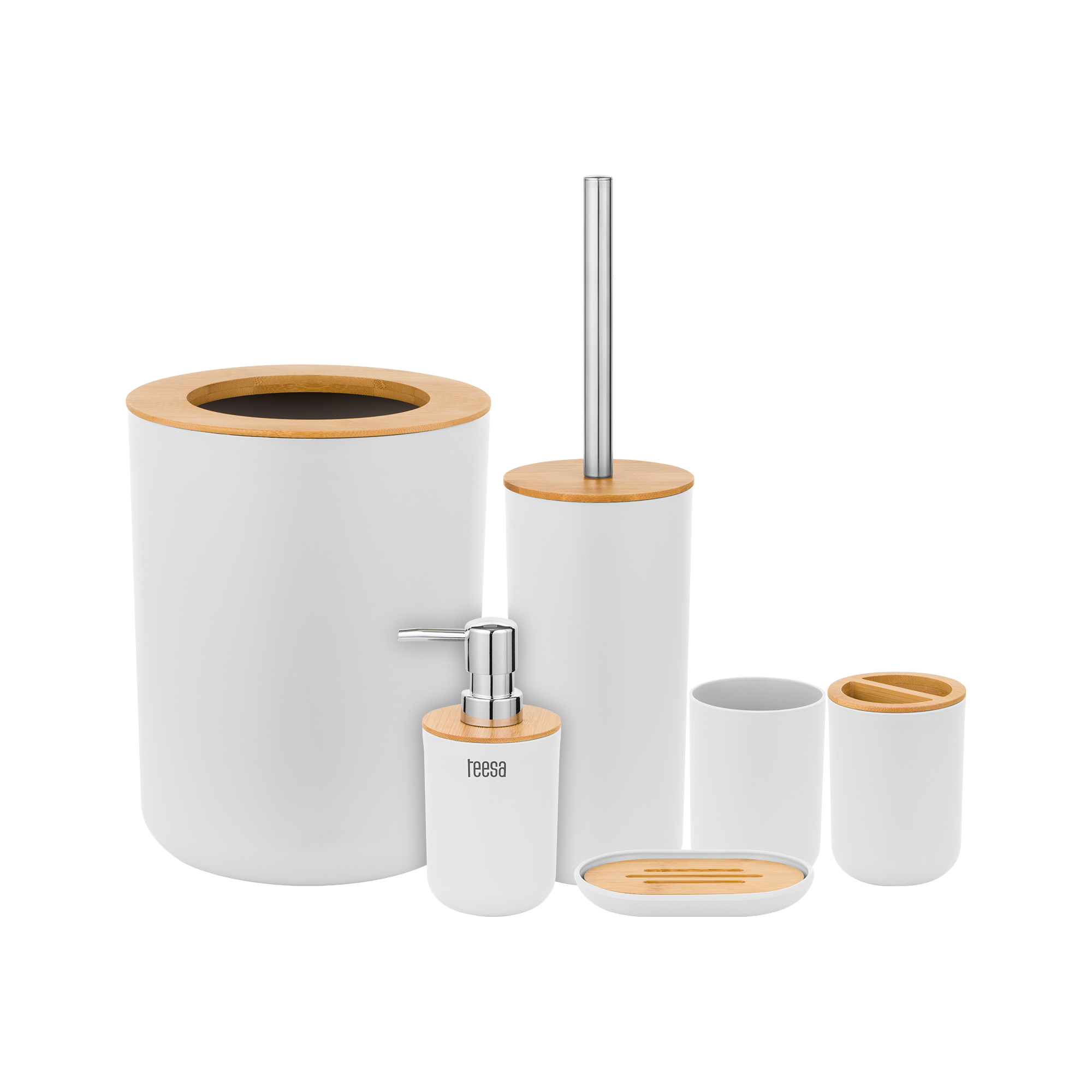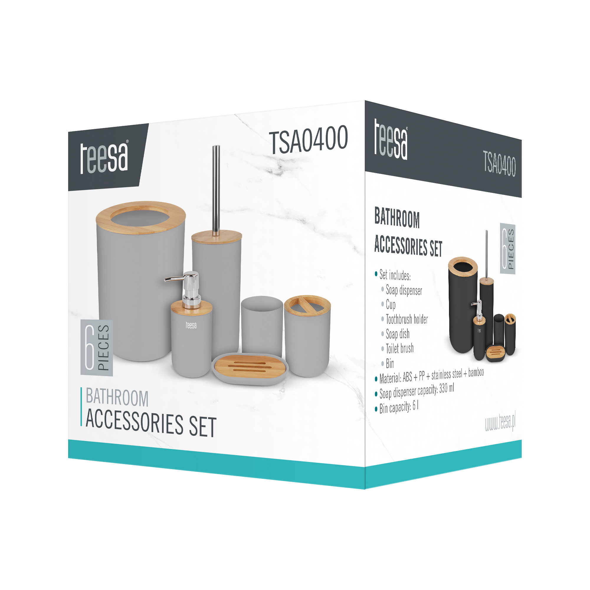 W jego skład wchodzą takie akcesoria do łazienki jak mydelniczka, dozownik mydła, kubek, kubek na szczoteczki do zębów, a także szczotka do WC oraz kosz na śmieci. Wszystkie akcesoria łazienkowe wykonane zostały z wysokiej jakości tworzywa sztucznego z dodatkiem drewna bambusa.
