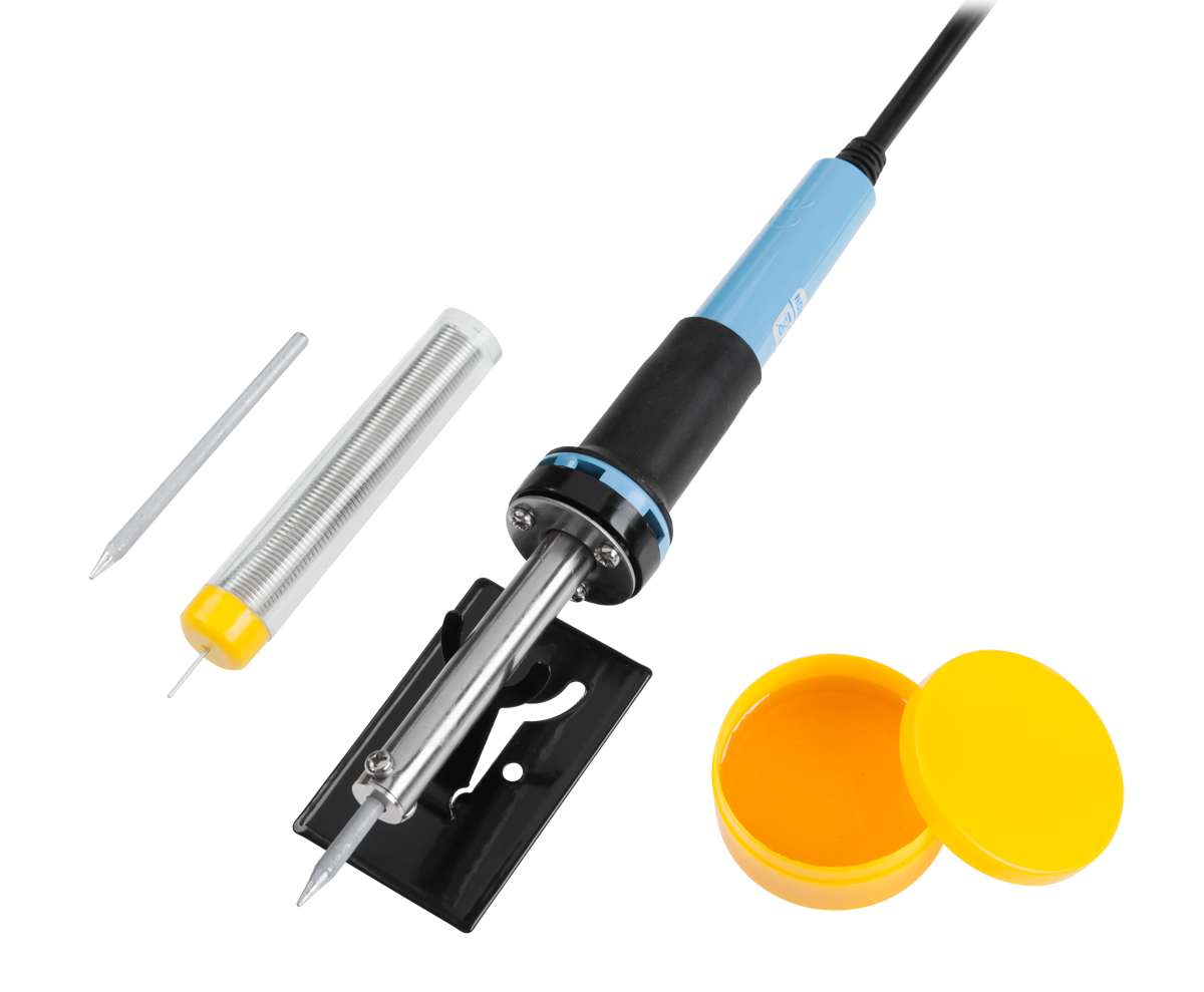 W zestawie: lutownica, cyna, pasta lutownicza, zapasowy grot, podstawka pod lutownicę