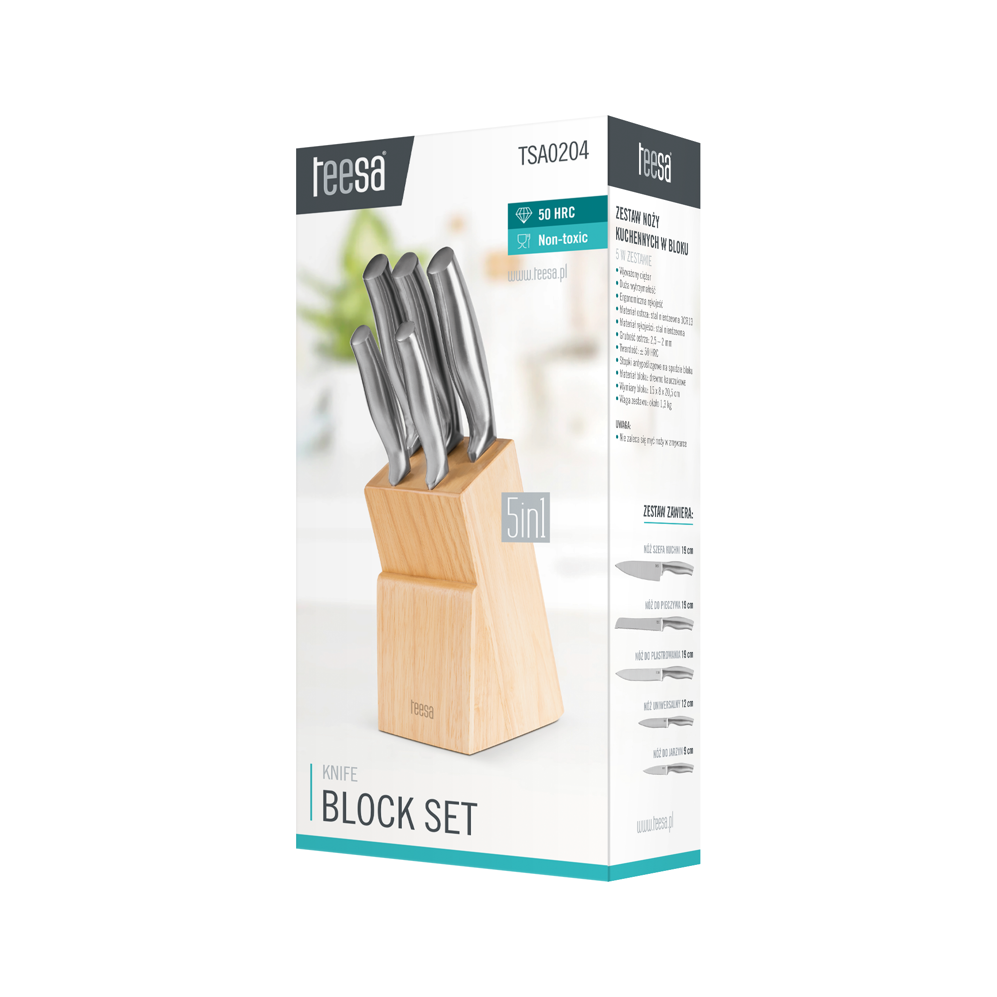 Ten komplet noży kuchennych w bloku z drewna nie tylko estetycznie wygląda, ale też zdecydowanie ułatwia utrzymanie porządku, zajmuje mało miejsca na blacie, a dzięki 5 różnym ostrzom jest uniwersalny. Noże z zestawu Teesa pomogą Ci w wielu codziennych czynnościach jak krojenie chleba, mięsa, filetowanie ryb, obieranie owoców i warzyw czy siekanie ziół.
