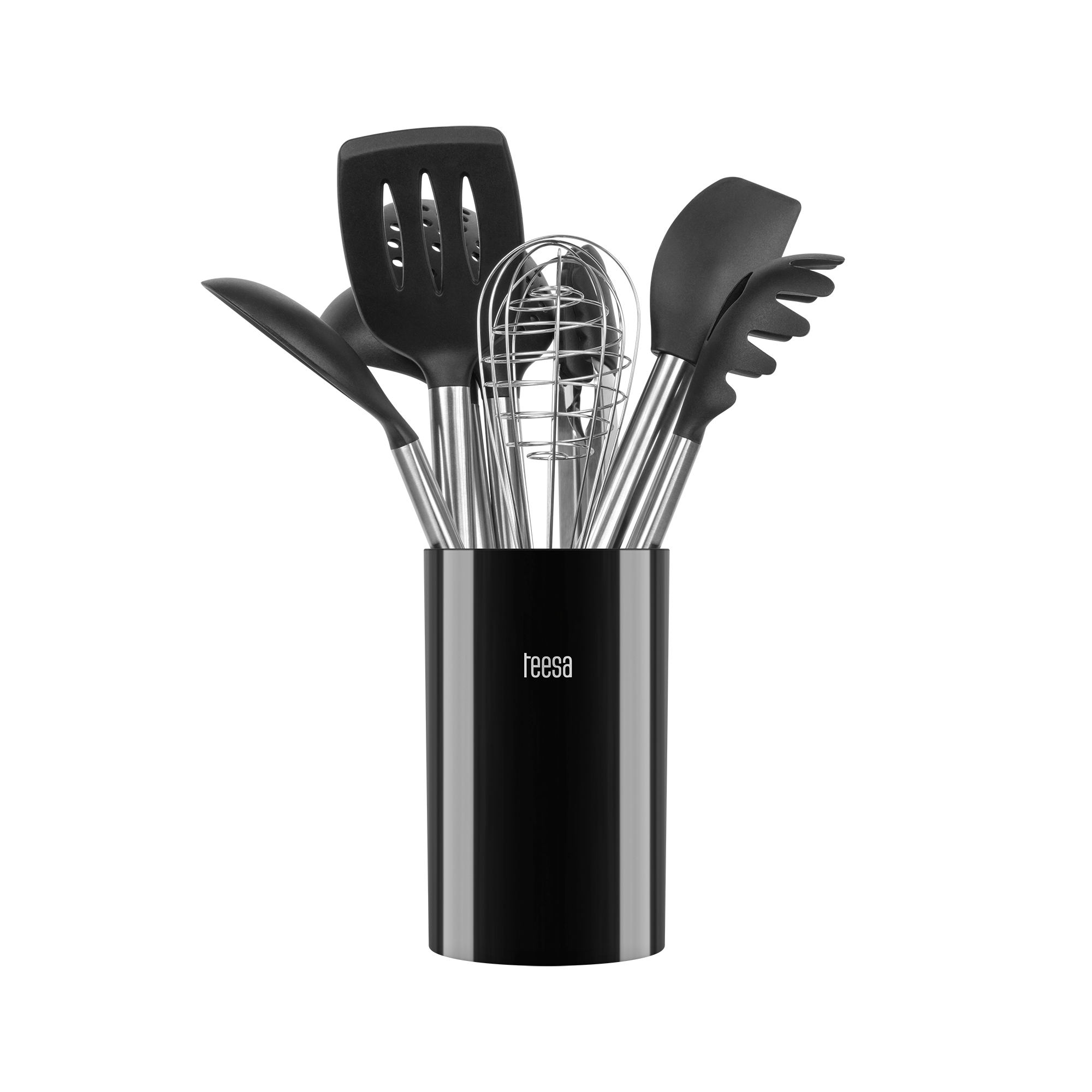 W skład zestawu wchodzą wszystkie niezbędne akcesoria, które pomogą Ci w przygotowaniu codziennych posiłków, np. chochla, łyżka do serwowania potraw oraz do spaghetti, łopatka i łyżka cedzakowa, trzepaczka i szczypce. Dołączony do zestawu pojemnik, w połączeniu z elegancją akcesoriów sprawi, że zamiast trzymać przybory w szufladzie, będziesz chciała je wyeksponować, by były zawsze pod ręką.