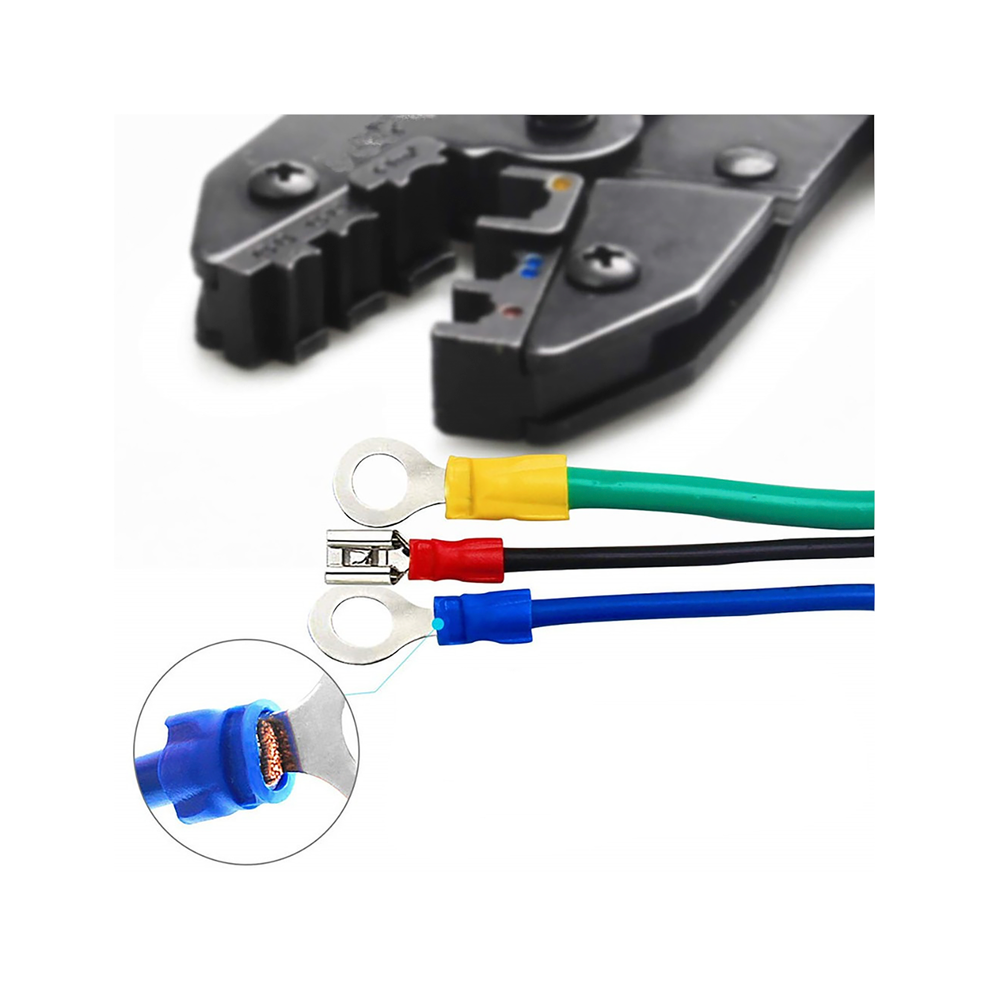 Przy pomocy solidnego zestawu składającego się z zaciskarki i 700 końcówek kablowych można szybko i precyzyjnie wykonać okablowanie elektryczne. Narzędzie jest przeznaczone do pracy w dużym zakresie zaciskania (szczęki zaciskowe w trzech rozmiarach z oznaczeniami kolorów), jest wyposażone w mechanizm sprzęgłowy niewymagający użycia dużej siły oraz zapewniający poprawne zaciśnięcie. Kolorowe oznaczenia rozmiarów końcówek kablowych i zaciskarki ułatwiają pracę. Standardowe końcówki kablowe są przejrzyście posortowane w praktycznym pojemniku do przechowywania.