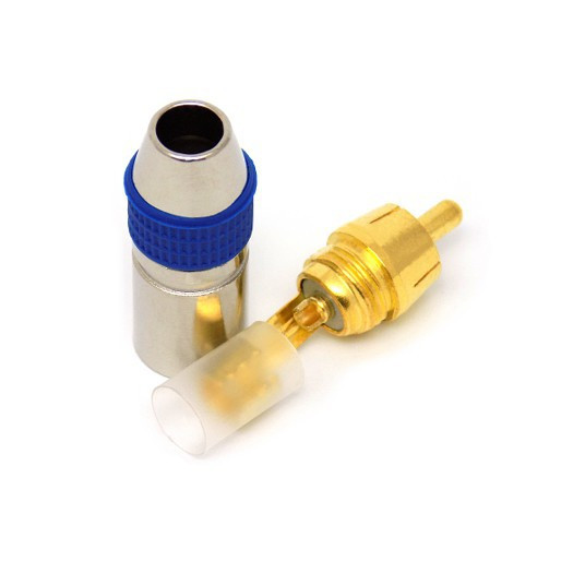 Metalowy wtyk RCA (cinch) ze złoconymi końcówkami styków i połączeń oraz niebieską opaską. Przeznaczony do montażu na kabel o średnicy 6 mm.