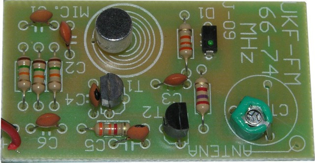 Miniaturowy nadajnik UKF o dużej czułości i zasięgu ok.100m. Może służyć do kontroli ochranianych obiektów, nadzoru bawiących się w oddaleniu dzieci, doświadczeń szkolnych. Odbiór nadawanych sygnałów na dowolnym odbiorniku z zakresem UKF w paśmie OIRT (65,5-74 Mhz). W skład zestawu wchodzi mikrofon elektretowy. Strojenia układu dokonuje się tylko przy pomocy trymera. Wymagane zasilanie: 3-12V. Wymiary płytki 50x27mm.