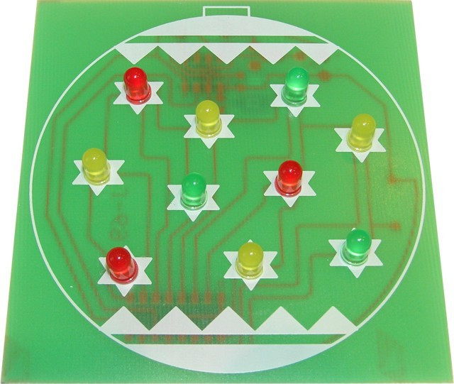 Elektroniczna ozdoba choinkowa. Na płytce montażowej w kształcie bombki zapalają się różnokolorowe diody LED. Układ można zasilać z baterii 9V. Wymiary płytki 90×90 mm.