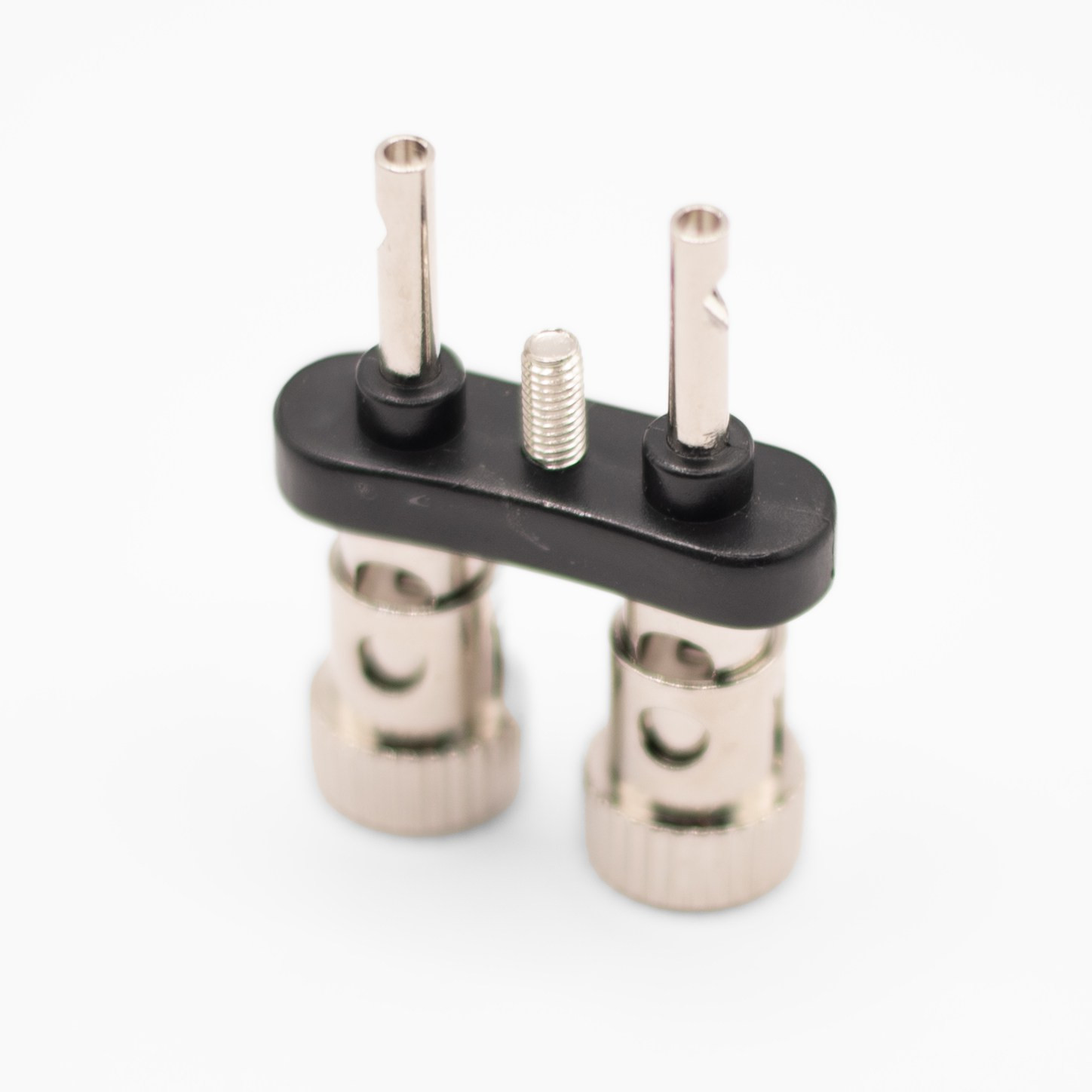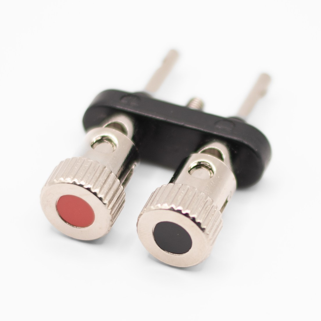 Podwójne gniazdo bananowe montażowe. Montowane do obudowy za pomocą śruby M4. Gniazdo pasuje na standardowe wtyki bananowe 4 mm. Montaż przewodów na lutowanie. Wtyki bananowe mocuje się po uprzednim naciśnięciu gniazda bananowego.