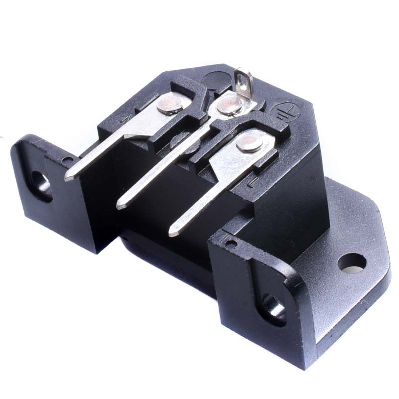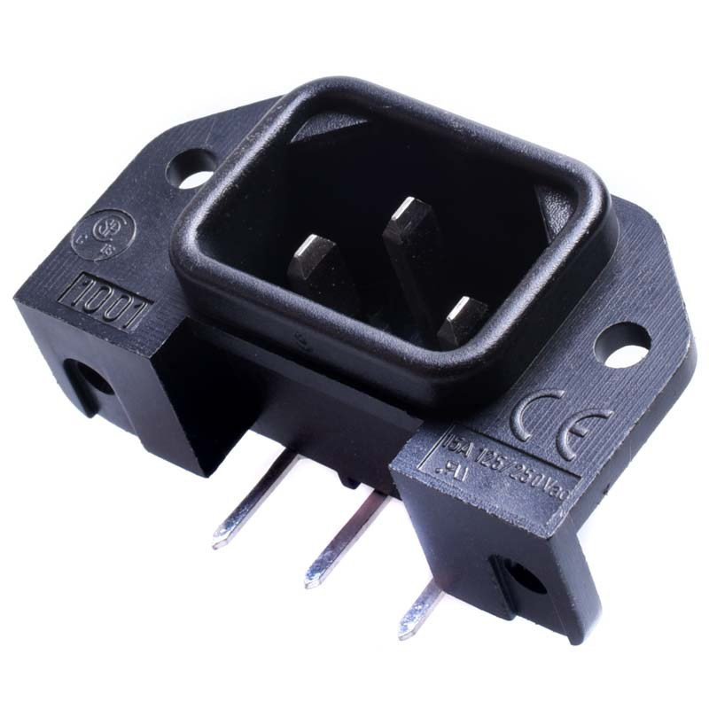 Gniazdo zasilające IEC320 szybkozłączne, do montażu w obwodach drukowanych. Posiada otwory montażowe.
